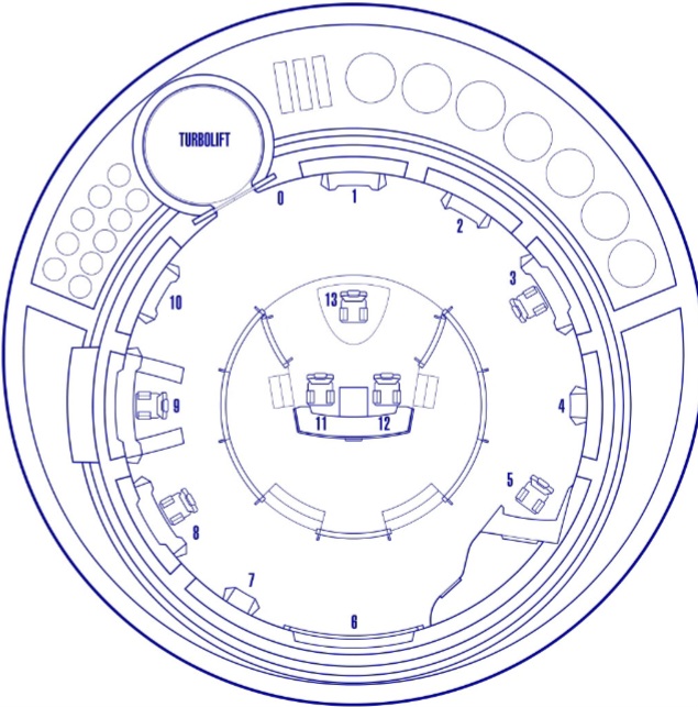 | Description | The bridge is the nerve center of the ship. From here, the senior staff can run all of the systems necessary to keep Unicorn in the fight. The positions numbered, are listed below: 0. Dedication Plaque 1. Environmental Control 2. Gravity Control 3. Engineering 4. Damage Control 5. Weapons and Defense 6. Main Viewscreen 7. Auxiliary Systems 8. Communications 9. Science 10. MACO Deployment Control 11. Navigation 12. Helm 13. Commanding Officer |